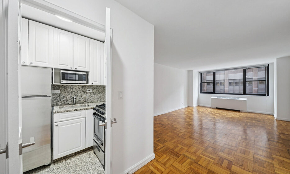 Spacious studio apartment located in Columbus Circle. Apartment features white appliances, renovated bathroom, and a spacious floorplan.