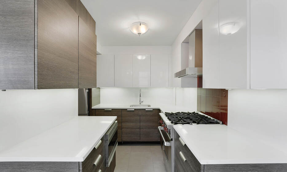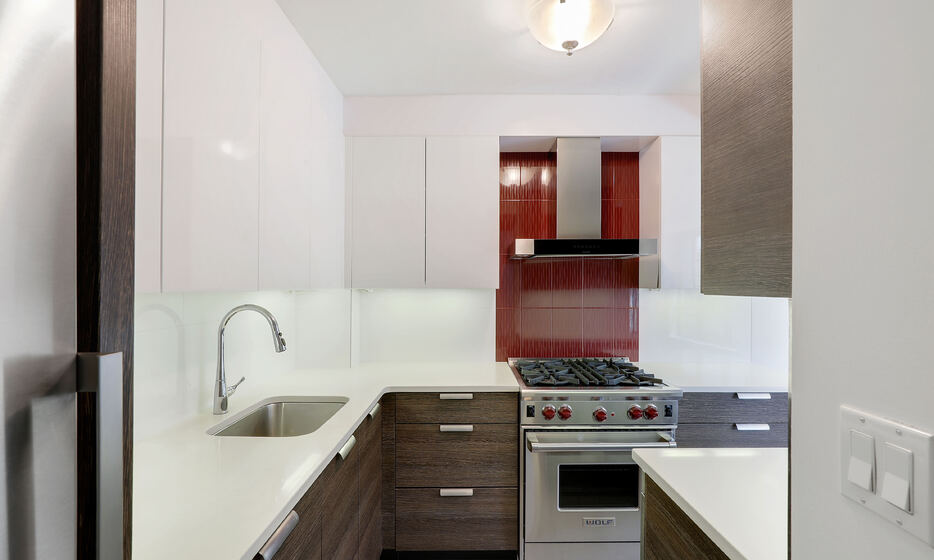 The contemporary chef’s kitchen is thoughtfully designed with sleek custom cabinetry, high-end Wolf and Sub-Zero appliances, and generous counter space. Adjacent to the kitchen, the living area is complemented by oak plank flooring, seamlessly connecting to the oversized terrace for effortless indoor-outdoor living.