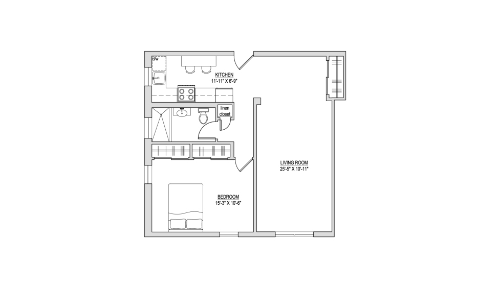 Renovated 1 bedroom, 1 bathroom apartment. This apartment features a renovated kitchen with white caesarstone countertops, custom cabinetry, and stainless steel appliances.