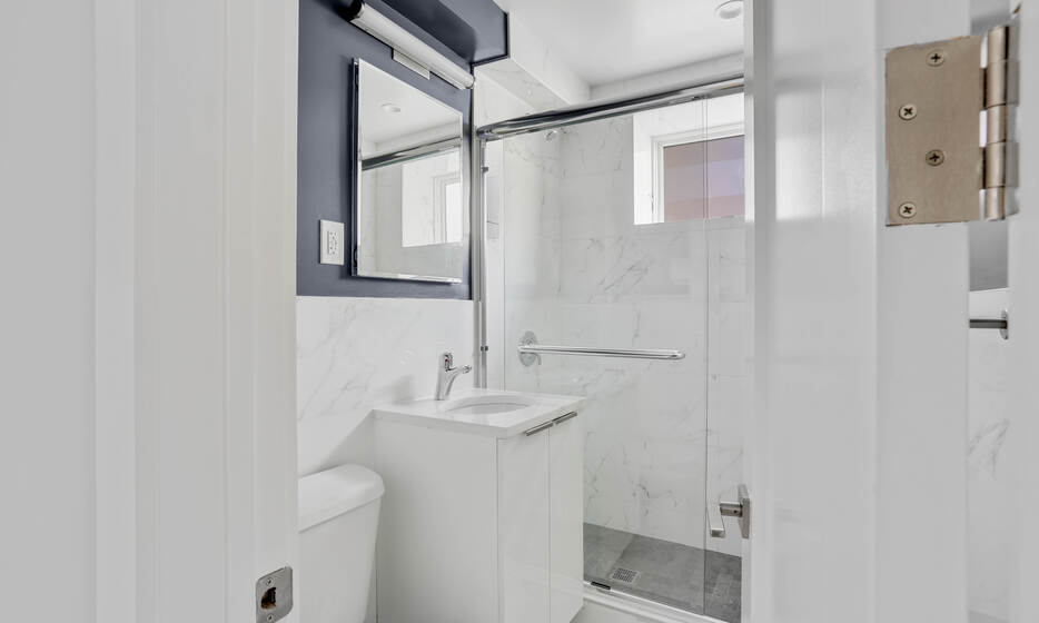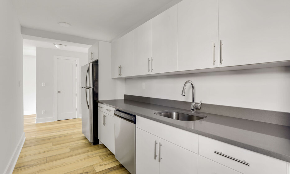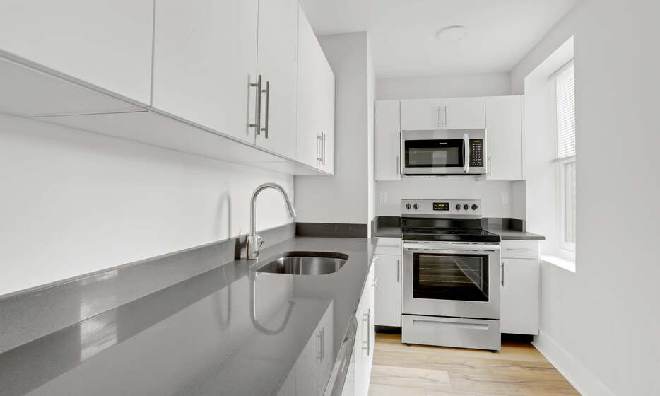 Renovated 1 bedroom, 1 bathroom apartment. This apartment features a renovated kitchen with white caesarstone countertops, custom cabinetry, and stainless steel appliances.