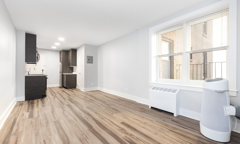 Renovated spacious studio, 1 bathroom apartment. This apartment features a renovated kitchen with white caesarstone countertops, custom cabinetry, and stainless-steel appliances.
