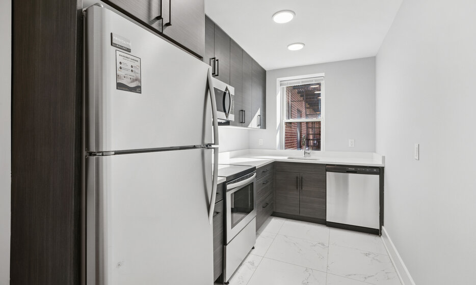 Renovated 1 bedroom, 1 bathroom apartment. This apartment features a renovated kitchen with white caesarstone countertops, custom cabinetry, and stainless steel appliances.