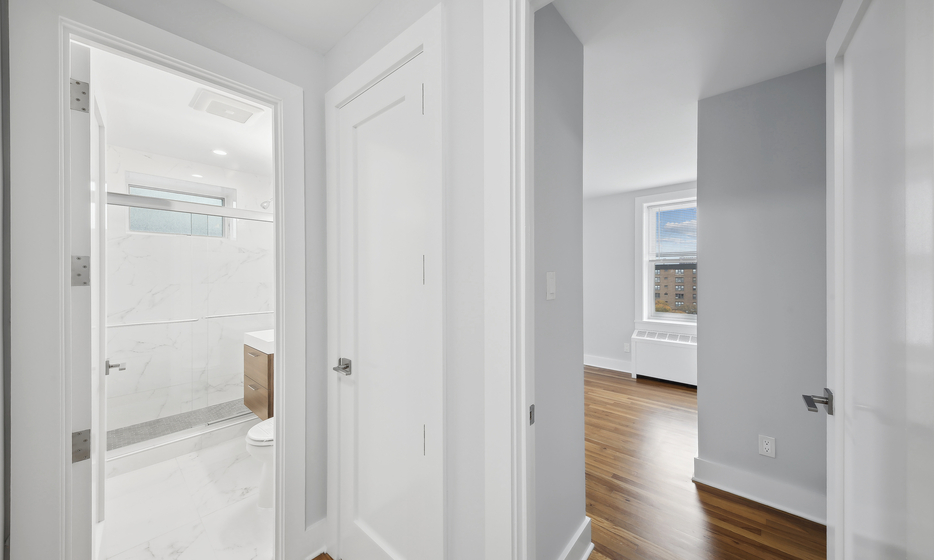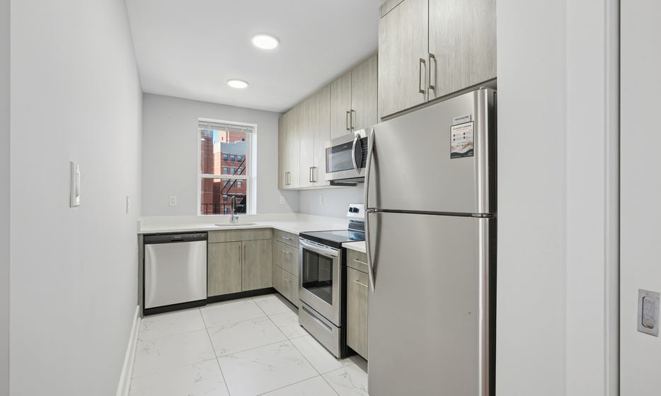 Renovated 1 bedroom, 1 bathroom apartment. This apartment features a renovated kitchen with white caesarstone countertops, custom cabinetry, and stainless steel appliances.